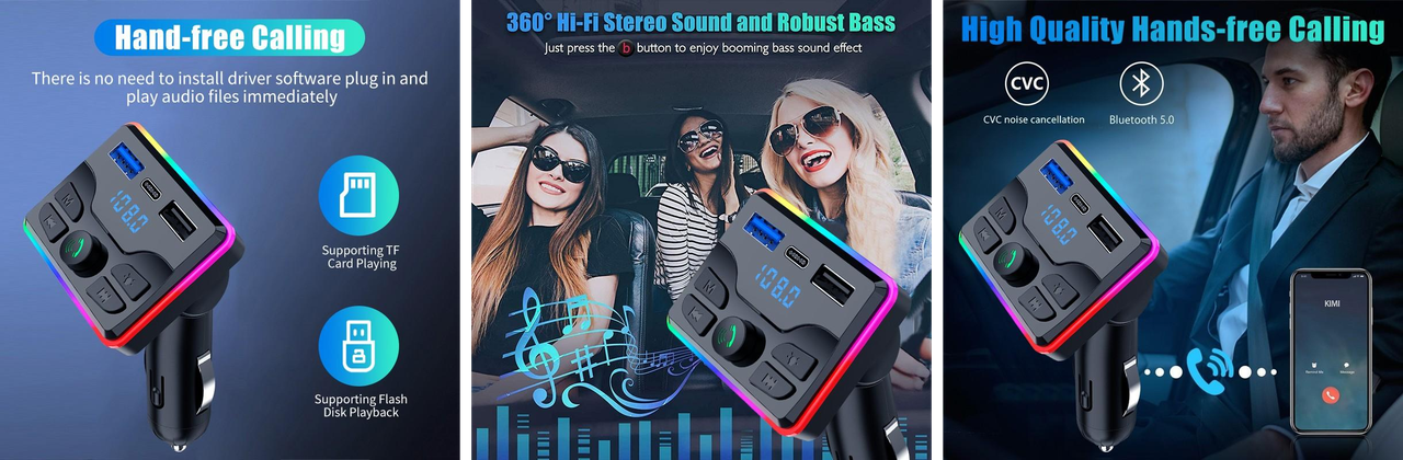 Два USB-порти для зарядки та швидкий Type-C: Модулятор має два USB-порти для зарядження пристроїв одночасно та швидкий зарядний порт Type-C для зарядження сумісних пристроїв з більшою швидкістю.