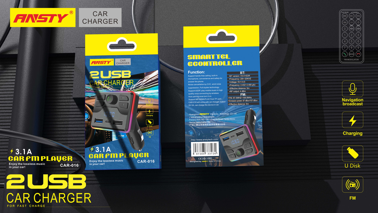 FM модулятор ANSTY CAR-016 - це стильний і універсальний пристрій для автомобіля, який дозволяє насолоджуватися вашою улюбленою музикою, заряджати пристрої та вести бездротові розмови в ході поїздки. Завдяки вбудованому Bluetooth і подвійним USB-портам ви зможете з легкістю підключити ваші пристрої та заряджати їх одночасно. Додайте до цього стильний дизайн і просте управління, і ви отримаєте ідеальний аксесуар для вашого автомобіля.