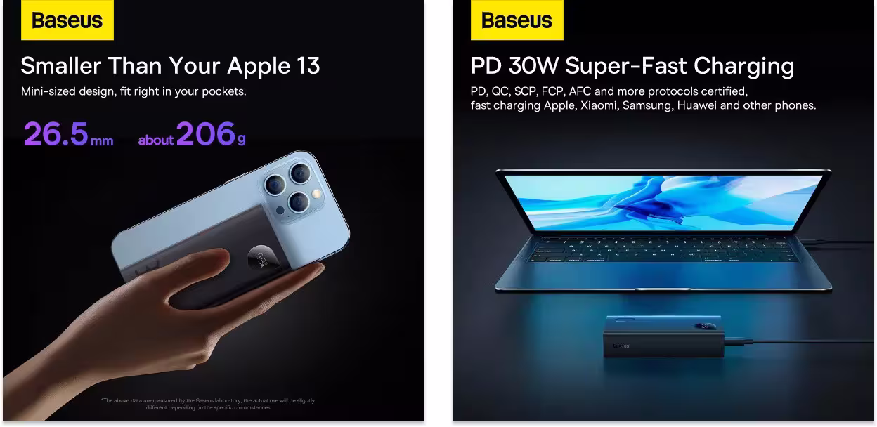 Даний Павербанк Baseus підтримує сучасні стандарти швидкої зарядки – Quick Charge 3.0, Power Delivery 3.0 (Apple), PD2.0, FCP/SCP (Huawei), AFC (Samsung), завдяки яким процес відновлення заряду Ваших аксесуарів пришвидшується у кілька разів. За допомогою технології Power Delivery 3.0 18W, iPhone 11, iPhone 12 поповнює заряд на 50 відсотків лише за півгодини. Зверніть увагу, що для цього вам знадобиться кабель із підтримкою PD. І за допомогою технології SCP 22.5W, HUAWEI P30 заповнює заряд на 60 відсотків теж лише за півгодини. А MacBook Air зарядиться до 48% лише за 55 хвилин, iPad Pro (2021) зарядиться до 50% всього за 55 хвилин. Також, порт Type-C підтримує новий стандарт технології швидкої зарядки - 9V/2.22A потужністю 20W для швидкого заряджання iPhone 13.