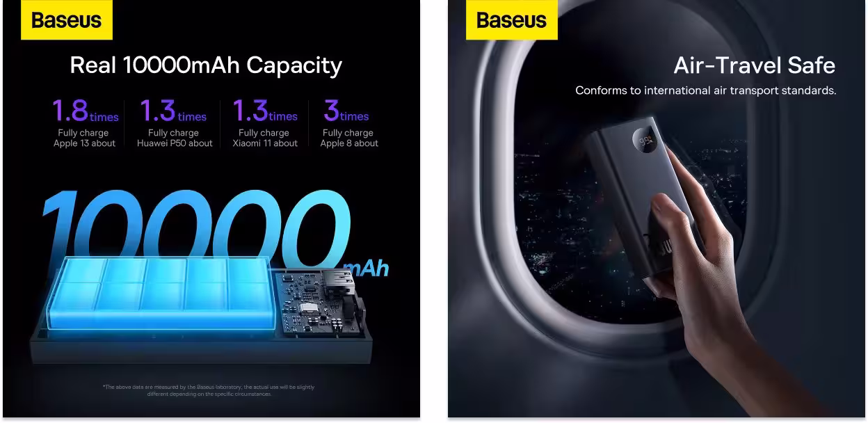 Батареї потужністю 10000 мАч вистачить для зарядки, наприклад: до 3 разів iPhone 8 або до 1,8 разів iPhone 13 або до 1,3 разів Huawei P50 або до 1,3 разів Xiaomi 11. Повербанк Baseus підтримує технологію швидкого заряду з потужністю 30 Вт. Ви не встигнете помітити, як девайс знову буде готовий до роботи. З такою ємністю батареї не потрібно турбуватися про те, що Ви залишитеся без телефону під час подорожі.