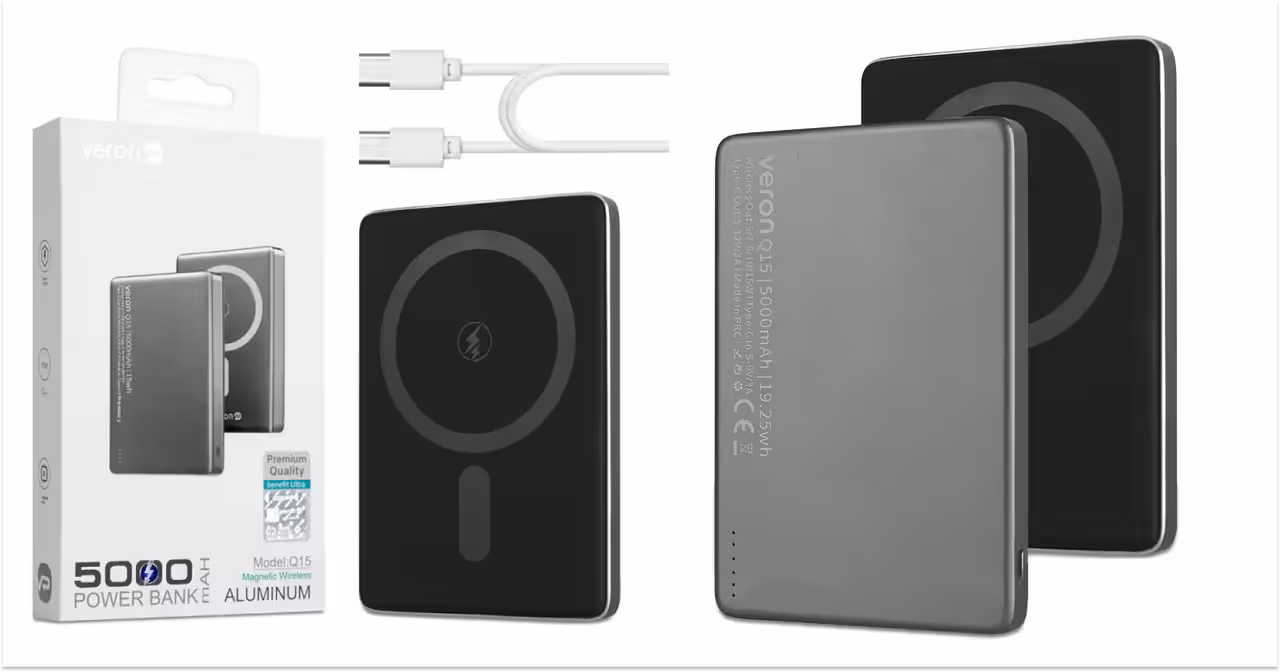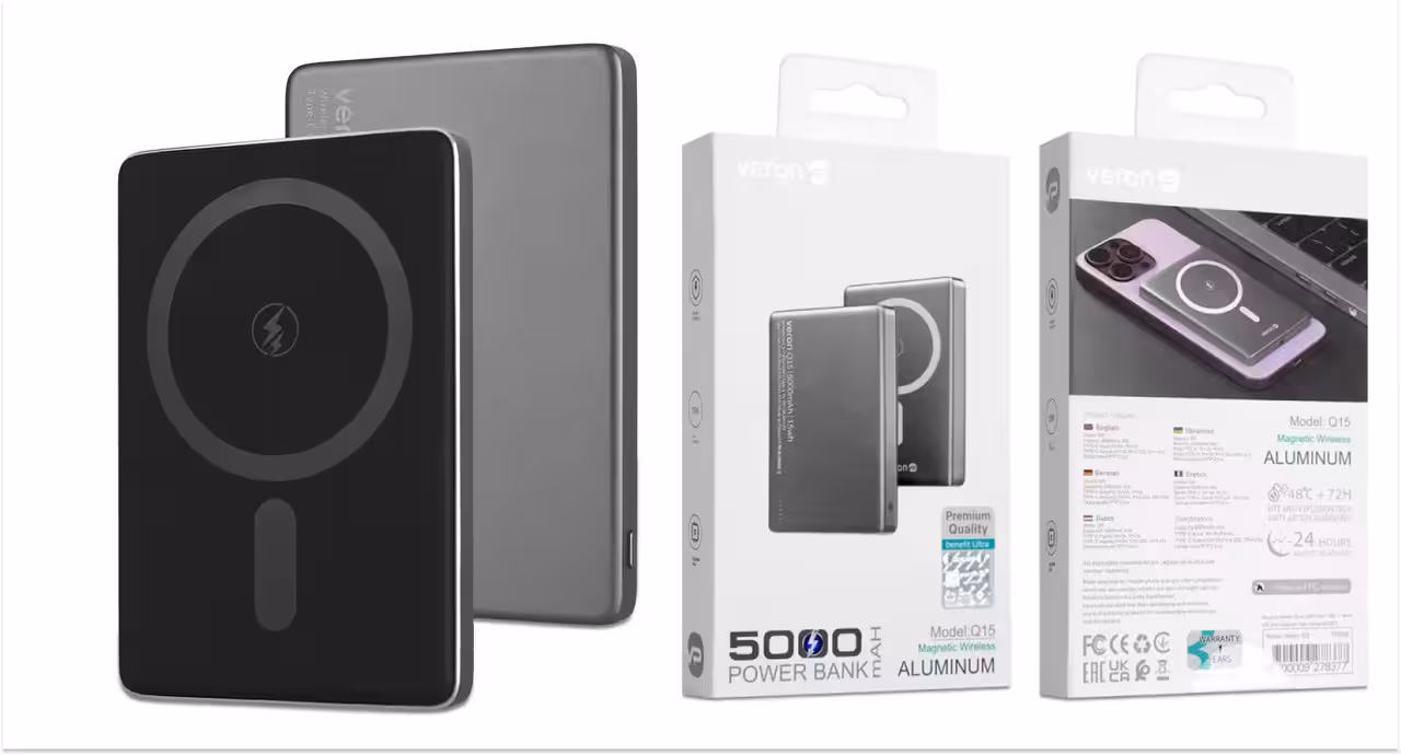 Зовнішній акумулятор Veron Q15 не лише функціональний, але й стильний. Сріблястий корпус надає йому елегантного вигляду, який гармонійно доповнить будь-який пристрій. Магнітна система кріплення забезпечує надійне тримання телефону навіть під час руху. Це особливо зручно під час поїздок або активного способу життя.
