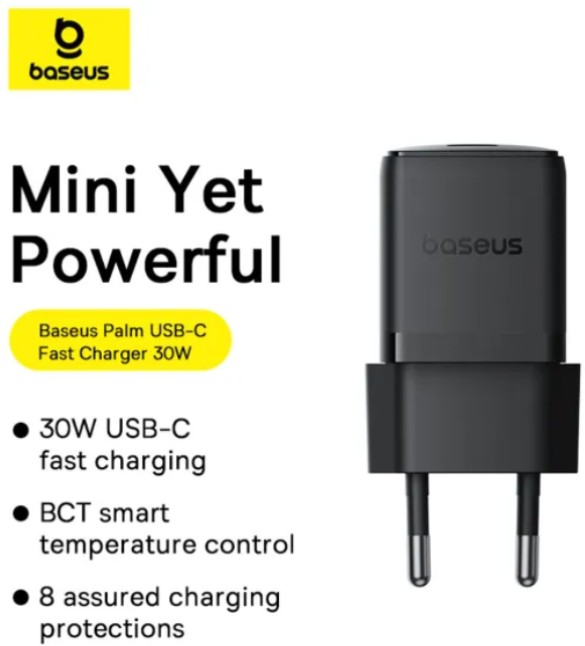 В наявностіМЗП Baseus Palm Fast Charger 1Type-C 30W + Cable Type-C to Type-C Black P10111605113-01