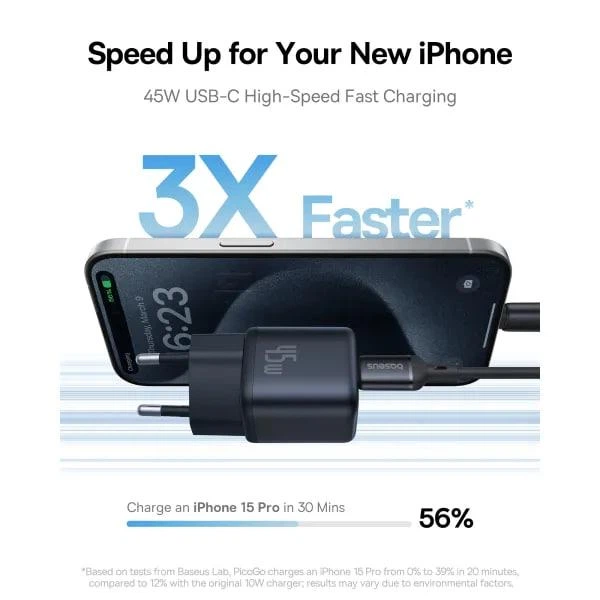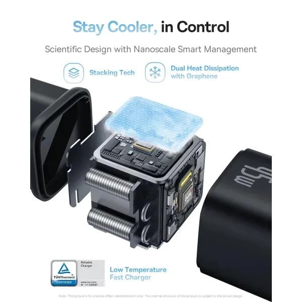 З максимальною потужністю до 45 Вт зарядний адаптер дозволяє значно скоротити час заряджання сумісних пристроїв. Модель підтримує популярні стандарти швидкої зарядки, зокрема PD, PPS, QC та інші, що гарантує широку сумісність із технікою різних брендів — від iPhone та Android-смартфонів до планшетів і деяких ноутбуків. Компактні розміри роблять адаптер зручним у транспортуванні, а продумана система відведення тепла допомагає підтримувати стабільну роботу навіть під навантаженням.