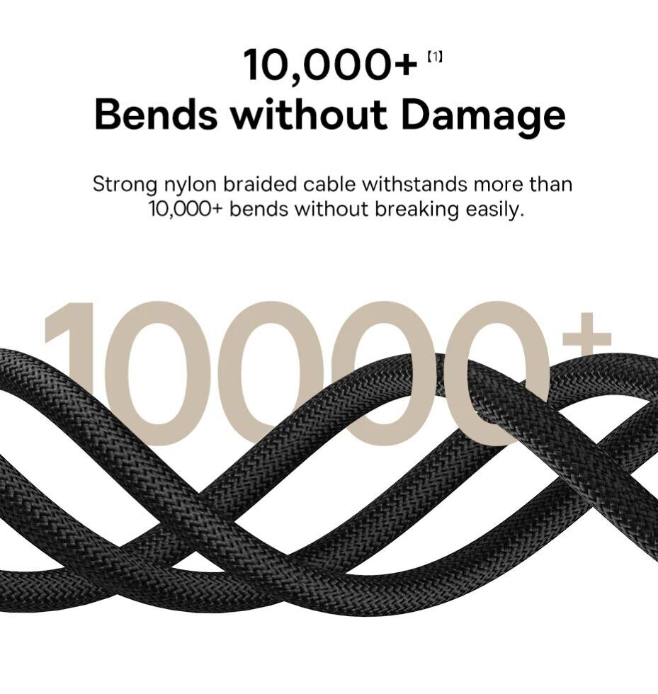 Конструкція моделі орієнтована на довговічність. Міцне нейлонове обплетення захищає кабель від заломів, розтягування та щоденного зношування, зберігаючи гнучкість і акуратний вигляд. Алюмінієві конектори вирізняються підвищеною стійкістю до механічних пошкоджень і корозії, забезпечуючи надійне підключення навіть після численних циклів використання.